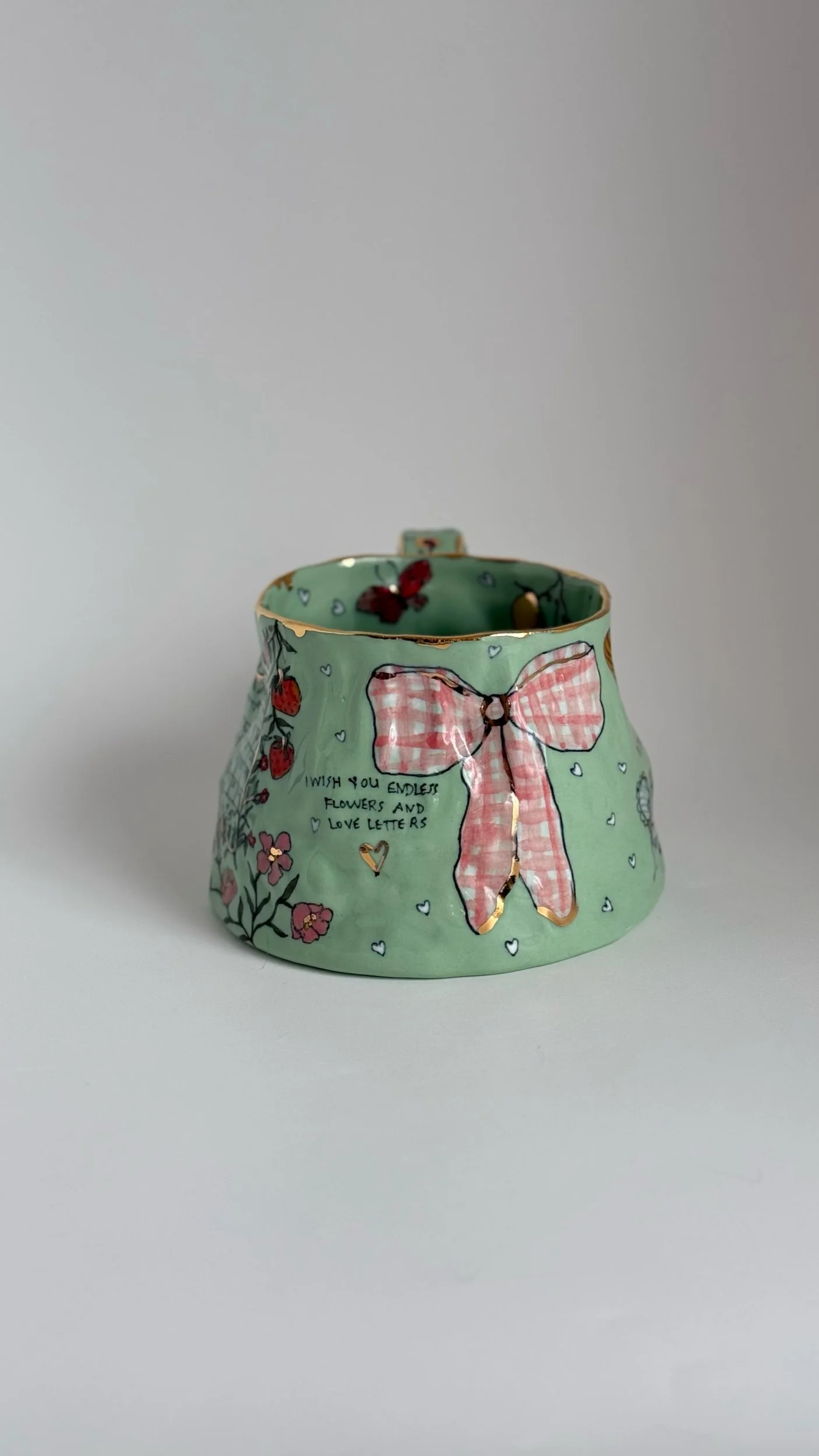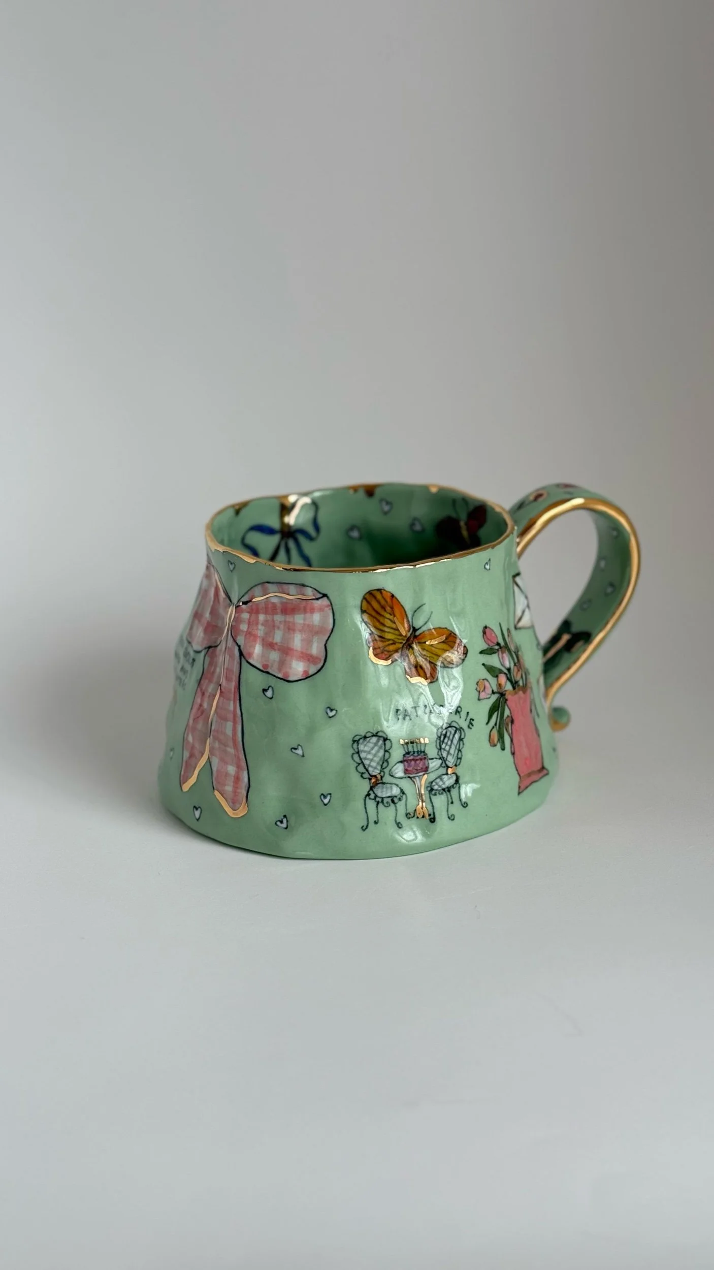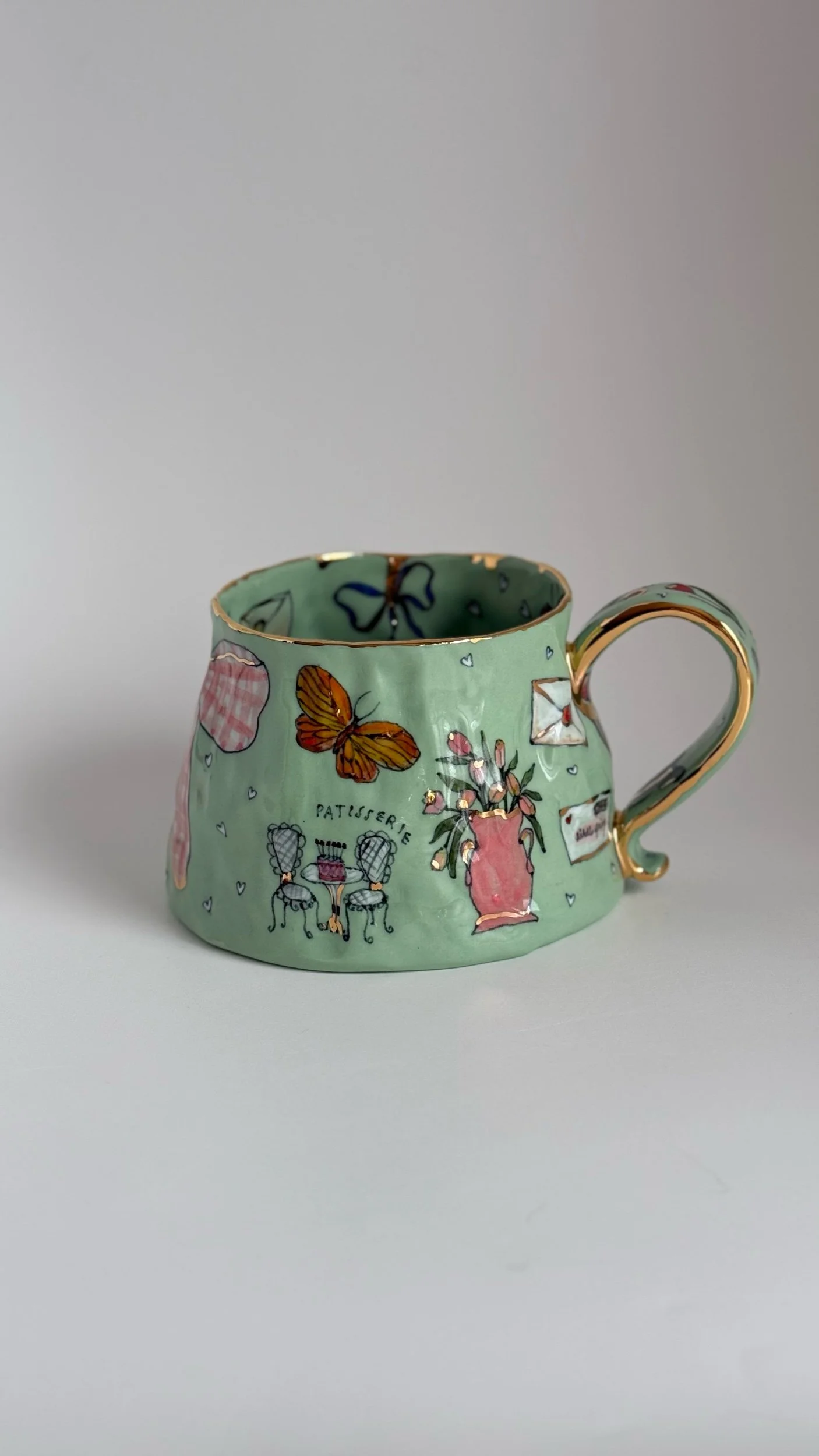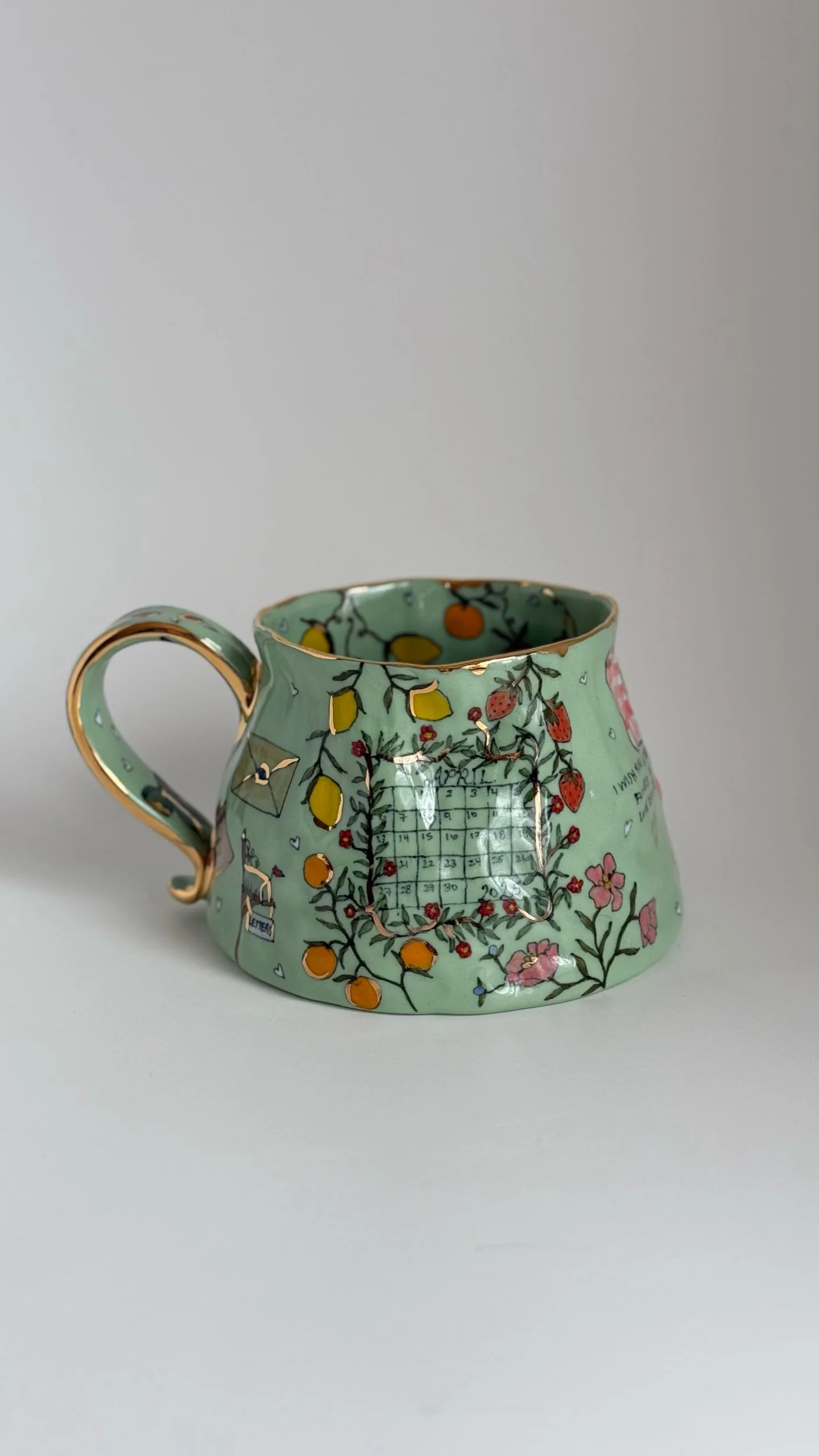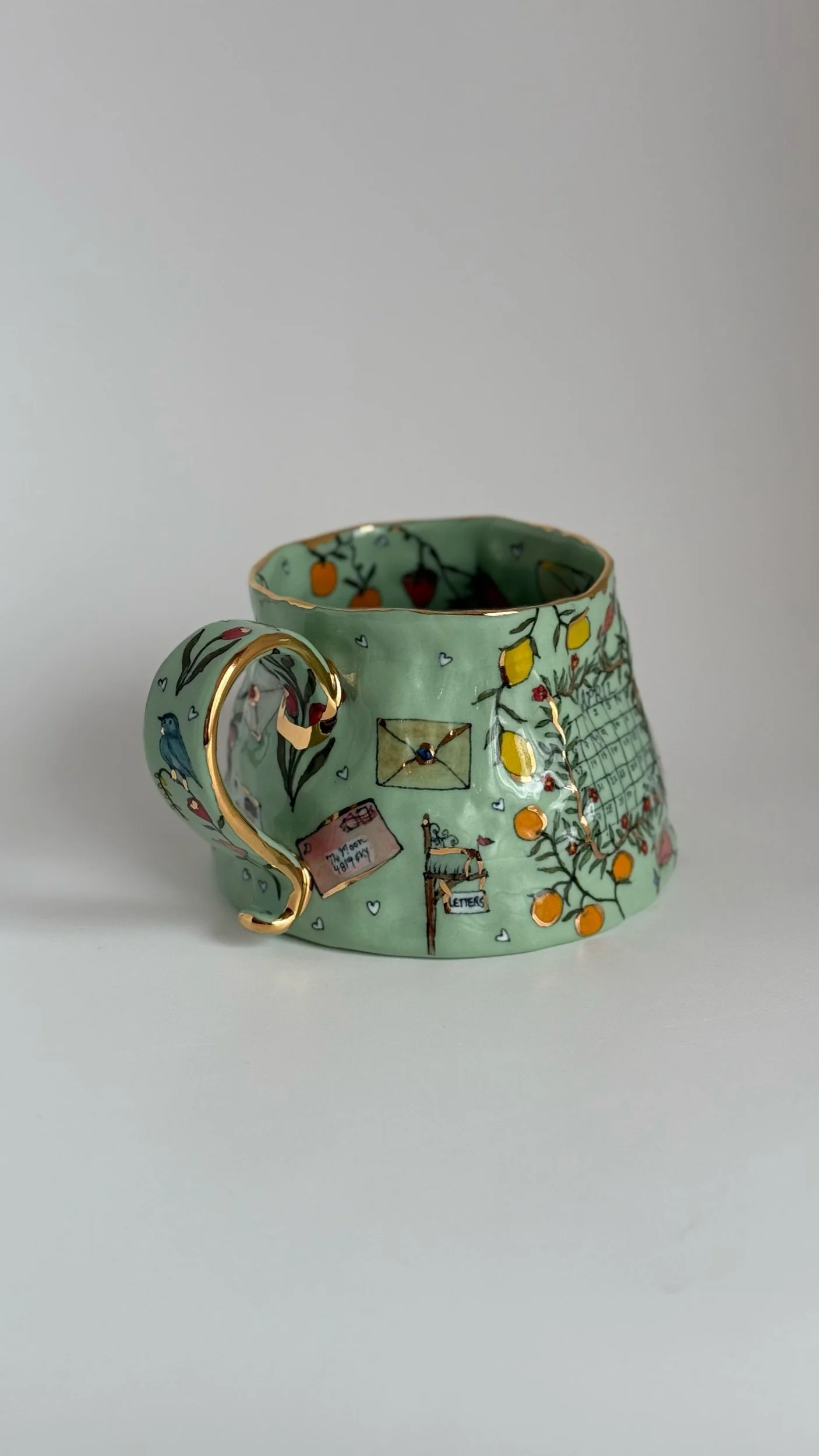 Hand painted using underglazes and gold luster