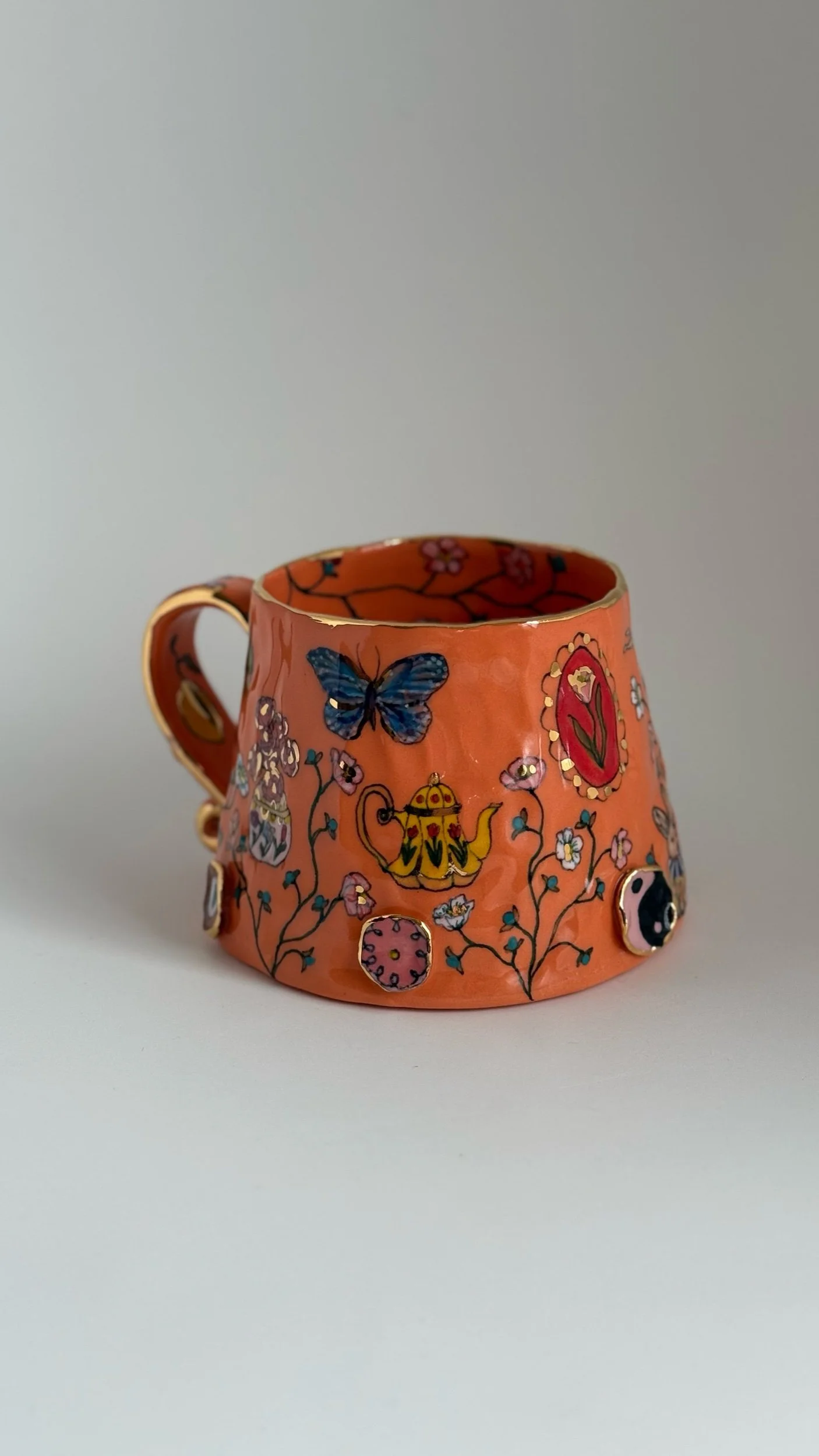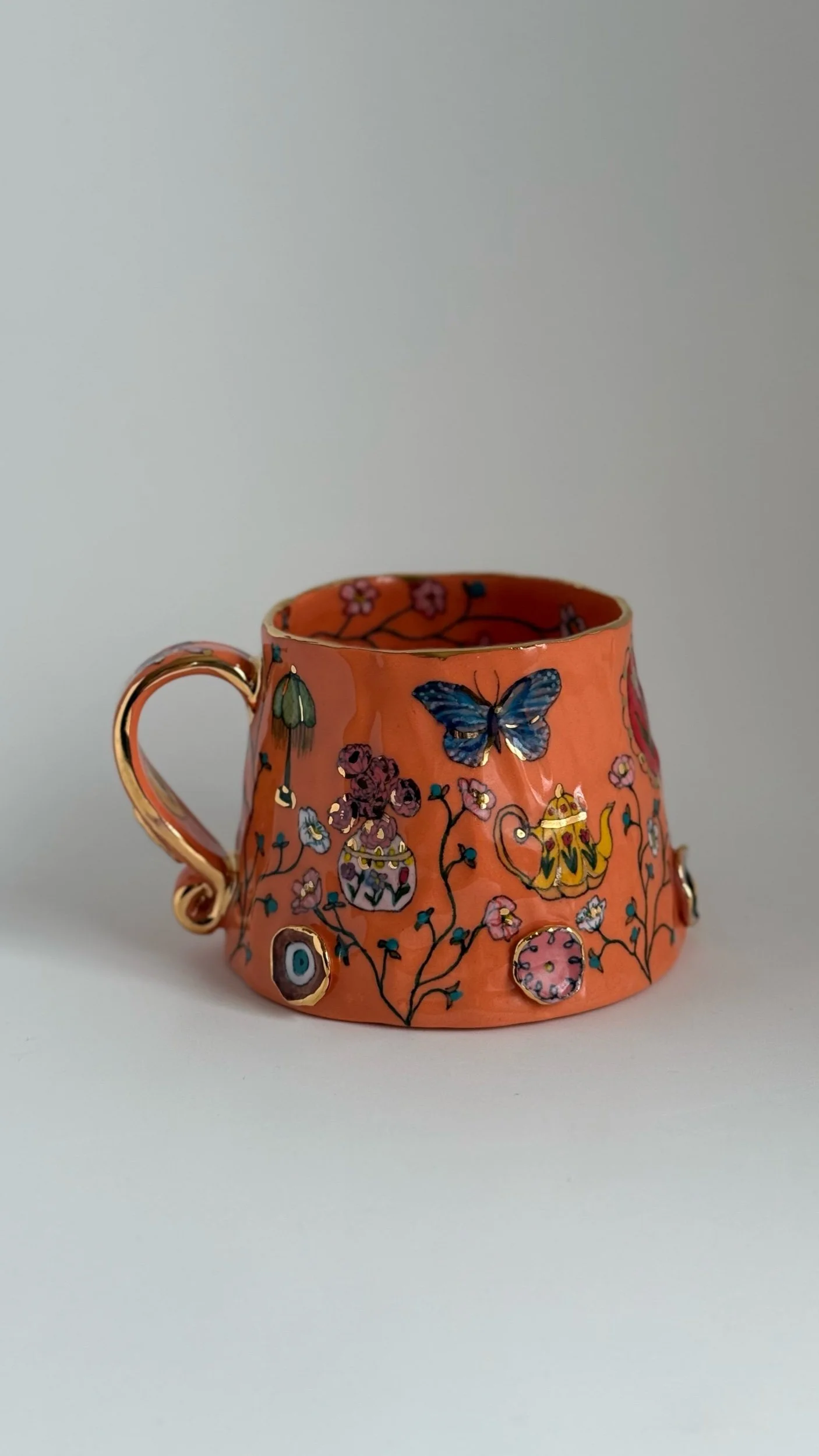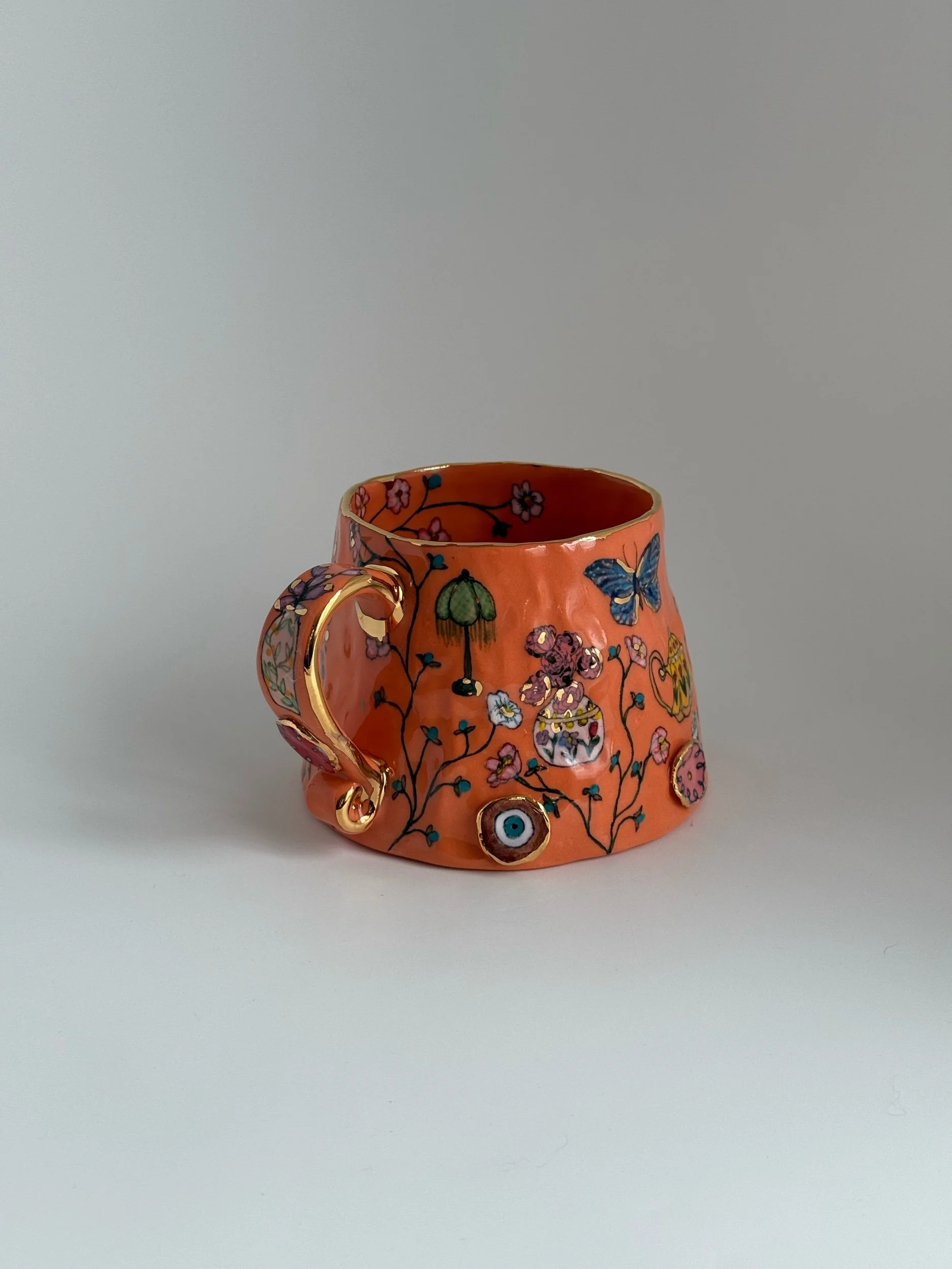 Hand painted using underglazes and gold luster
