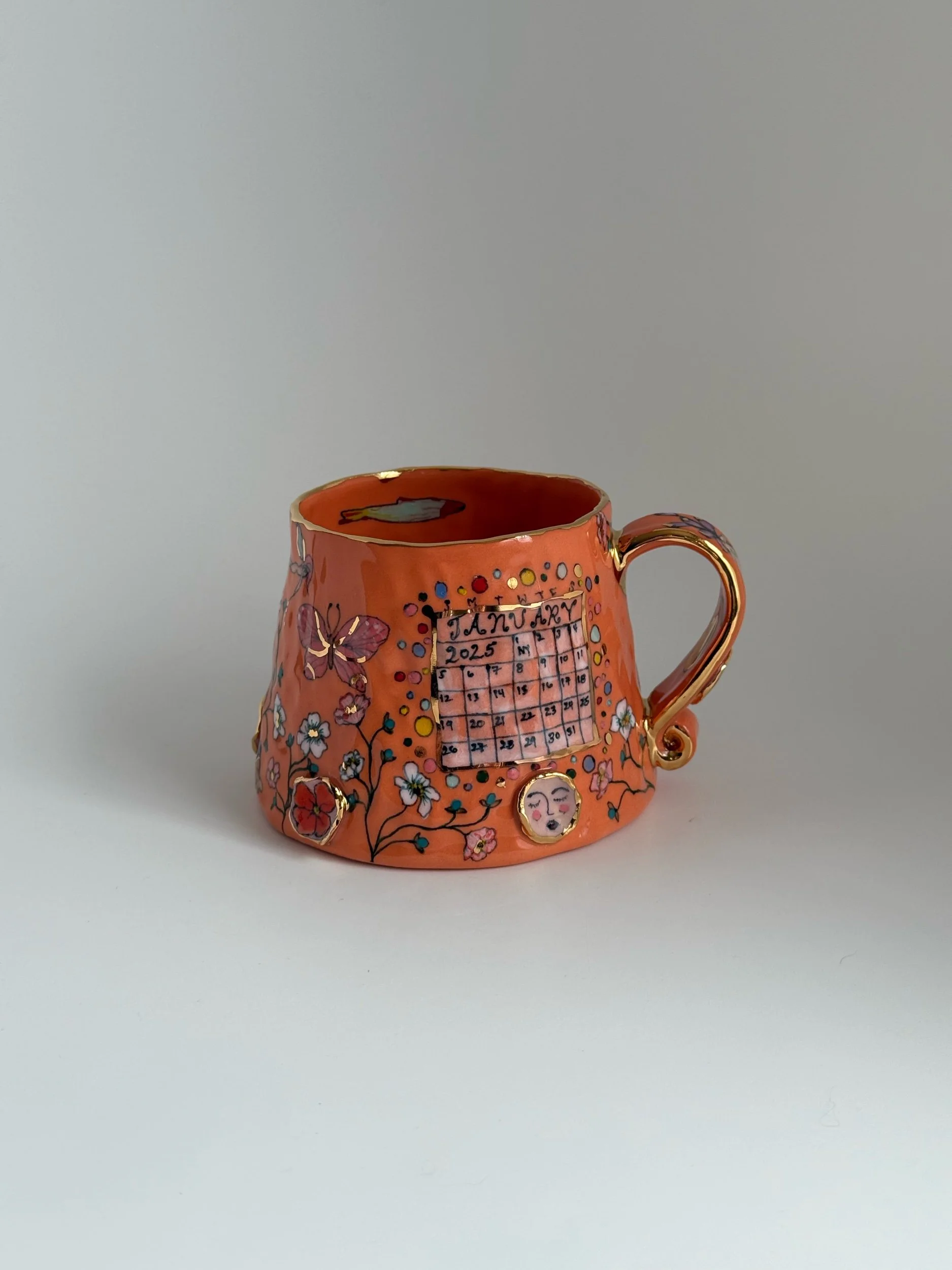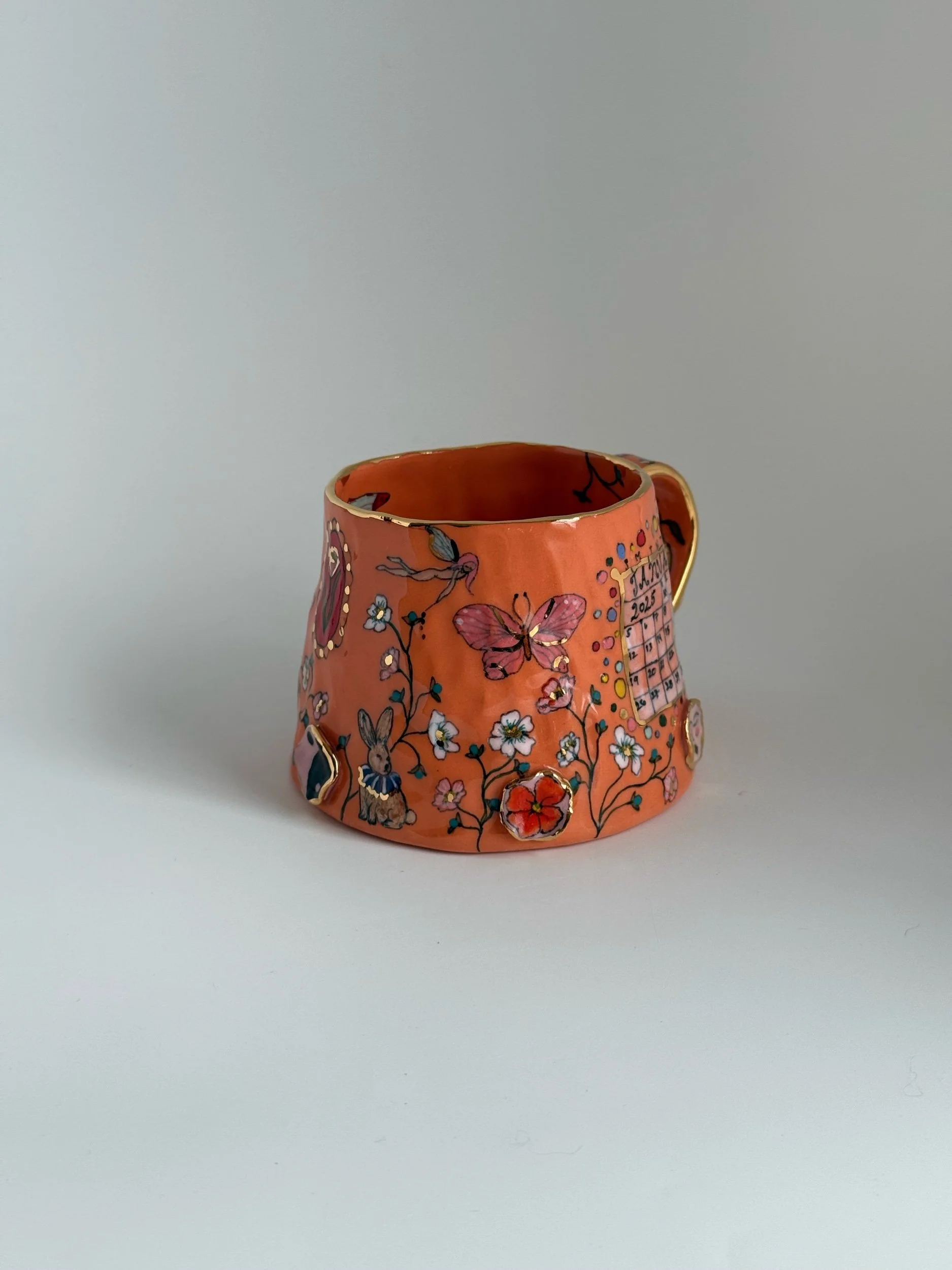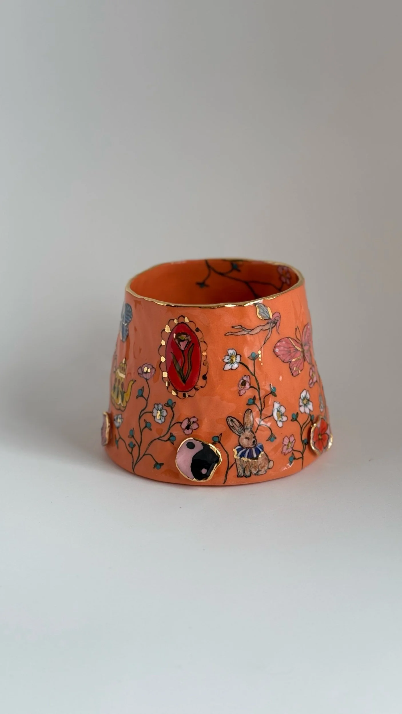 Hand painted using underglazes and gold luster